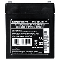 Батарея Ippon IP12-5 — необслуживаемая герметичная свинцово-кислотная, источник постоянного тока, предназначенный для обеспечения резервным питанием устройств, подключенных к ИБП систем безопасности, аварийного освещения и сигнализации, автоматизированного управления, телекоммуникации. Емкость АКБ — 5 А·ч, напряжение питания — 12 В.