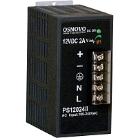Промышленный блок питания. DC12V, 2A (24W). Диапазон входных напряжений: AC100-240V. КПД: 80%. Защита от короткого замыкания, перенапряжения и перегрузки. Конвекционное охлаждение. Монтаж на DIN-рейку или стену. Размеры (ШxВxГ): 45x96x75мм. Рабочая температура: -40...+50°C.