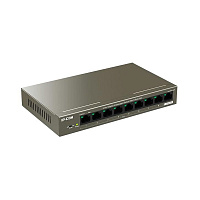 - Девять гигабитных портов: восемь RJ-45 с PoE, один гигабитный uplink.