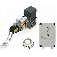 Комплект автоматики Nice SD12020400KEKIT, состоящий из электромеханического привода NDCM077, блока управления D-PRO Action NDCC2200, соединительного кабеля с разъемными колодками CA0175A00 (7 м) и цепи аварийного подъема (10 м), рассчитан на промышленные секционные ворота площадью до 42 м².