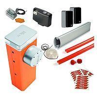 Комплект автоматического шлагбаума Nice M7BAR7BDKIT1 для проезда шириной 7 м состоит из тумбы M7BAR, пары фотоэлементов EPMB, приемника OXIBD, стрел из окрашенного алюминия XBA15-3RU и XBA14-4RU (69×92×3200 мм и 69×92×4200 мм), соединителя XBA9 (длина 700 мм, алюминий), демпферов XBA13 (9 шт. в упаковке), семафорной лампы XBA8, сигнальной LED-подсветки XBA18 (дюралайт, 8 м, резать для укорачивания — через 1 м), двух упаковок светоотражающих наклеек NK1.